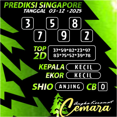 Prediksi ANGKA KERAMAT SINGAPORE 03 DESEMBER 2025 berdasarkan dari Prediksi Cemara yang sudah diperhitungkan dengan sangat baik. Dengan perhatian yang penuh untuk mendapatkan Angka yang tepat untuk Jackpot Dipasaran Singapore